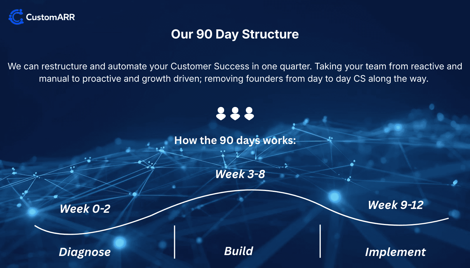 Our engagement is structured, hands-on, and designed to remove operational stress from your team. We take ownership of the entire transformation so you see impact quickly and leave with a Customer Success function that can scale long after the 90 days are over.